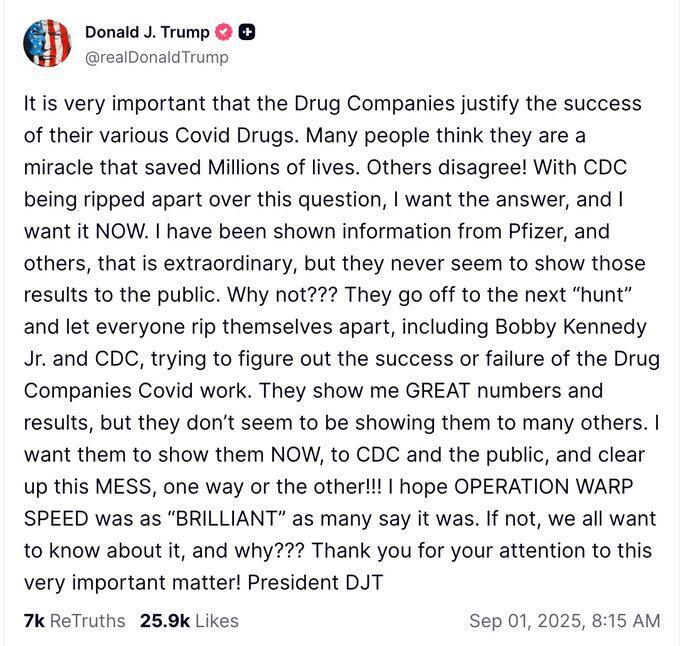 According to Trump, drugmakers need to "clear up this MESS," adding that they "let everyone rip themselves apart, including Bobby Kennedy Jr. and CDC, trying to figure out the success or failure of the Drug Companies Covid work."