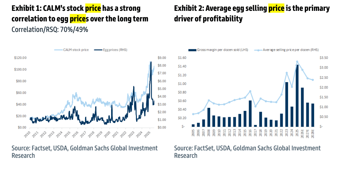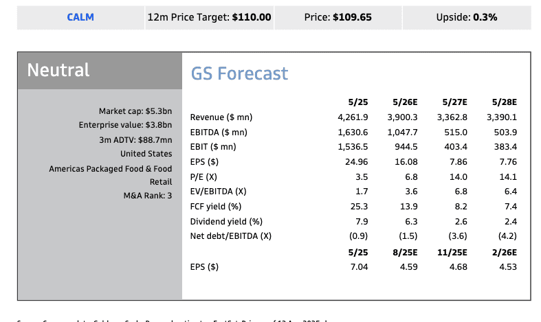 Goldman Sachs analysts Leah Jordan and Eli Thompson initiated coverage on Cal-Maine Foods with a "Neutral" rating and a 12-month price target of $110 on Thursday. The coverage comes as the analysts believe the nation's egg supply has likely normalized.