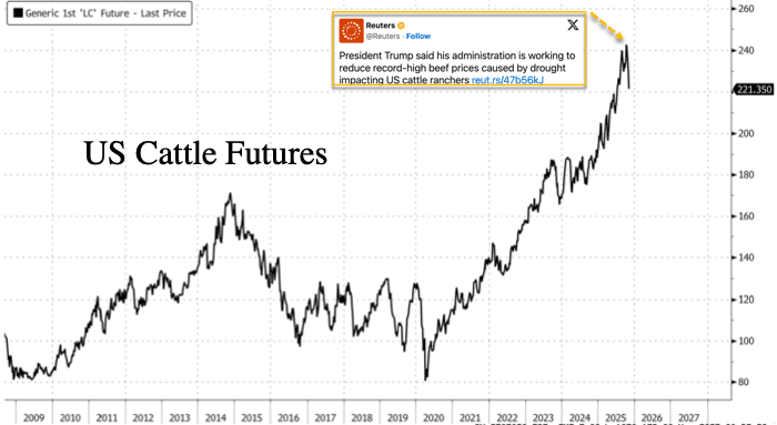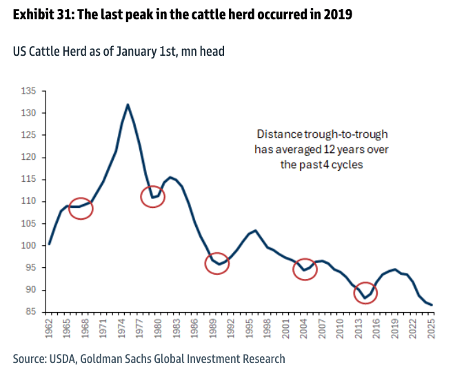 Great news for the Trump administration: In June, Goldman analysts Leah Jordan and Eli Thompson signaled that the 12-year cattle herd cycle has likely reached a cyclical low, suggesting a rebuilding phase may be approaching.
