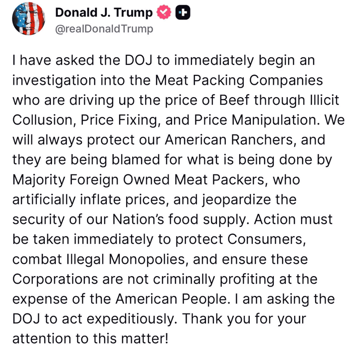 President Trump has directed the Justice Department to investigate the meatpacking cartel - JBS, Cargill, Tyson Foods, and National Beef - for potential collusion, price-fixing, and price manipulation. The four companies, two of which are foreign-owned, now control 85% of the U.S. beef processing market, up from just 36% in 1980.