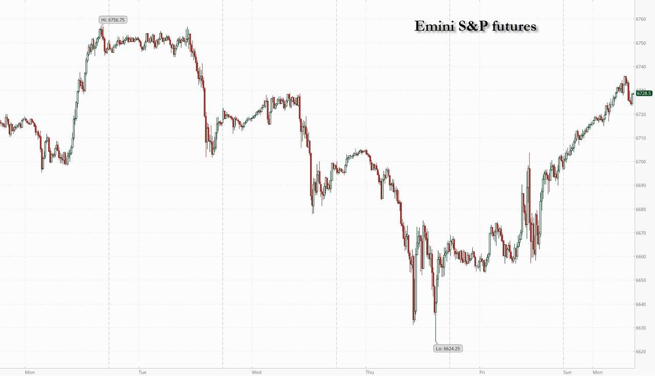 Last week's small market swoon is a distant memory with US equity futures up sharply on Monday, led by tech and small caps as the S&P looks to set a new ATH. As of 8:00am ET, S&P futures are up 0.5% (and off session highs) keeping the benchmark on track for its best September since at least 2013, even as the month is typically difficult for stocks. Mag7 / Semis are mostly higher premarket, and with Cyclicals leading Defensives after last week's stumble, the AI Theme looks resurgent again, helping sending European stocks broadly green. Most Asian equities advance as Chinese tech stocks resume rally. Hang Seng climbs for the first time in three sessions. Gold hit yet another record, topping $3,820 and pushing the market value of US gold reserves above $1 trillion, with a US government shutdown looming in 48 hours, while the dollar tumbles as clock ticks toward US shutdown deadline on Tuesday midnight. The yen strengthens below 149-handle and euro gains 0.2%. Yuan strengthens on industrial profits jump and a solid PBOC fixing. Treasury 10-year yield eases three basis points to 4.15%. WTI crude futures are offered around $65.30 on OPEC+ output hike expectations; commodities are weaker ex-Precious and Coffee which continue their bull runs. This is a heavy data week complicated by a potential government shutdown which could see labor market data delayed. The Fedspeech calendar is heavy with 12x speakers this week