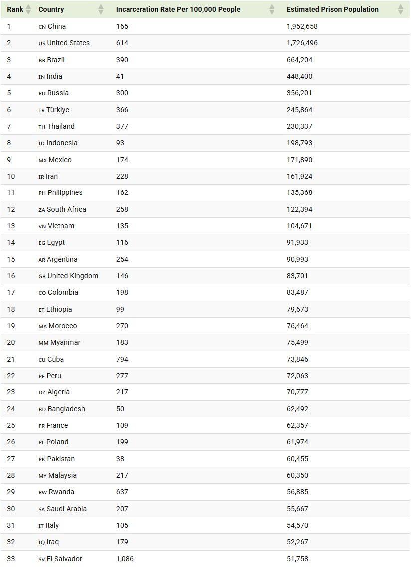 America follows next, with incarceration rates of 614 per 100,000 people—more than three times higher than in China. This figure jumps significantly in southern states, with Louisiana’s standing at 1,067 per 100,000 people—second only to El Salvador in the world if it were considered a nation.