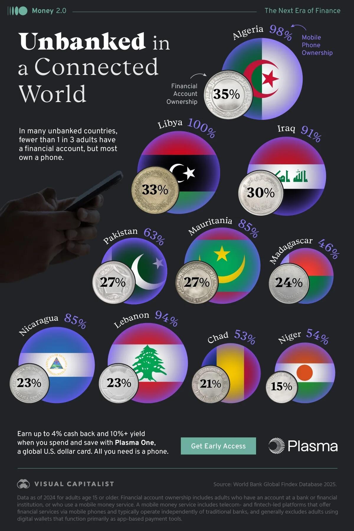 Financial exclusion remains high in many parts of the world. In several countries, more than two out of three adults are unbanked, yet the majority own a mobile phone. This contrast between connectivity and financial access highlights both the persistent gaps in global inclusion and the massive opportunity to close them.