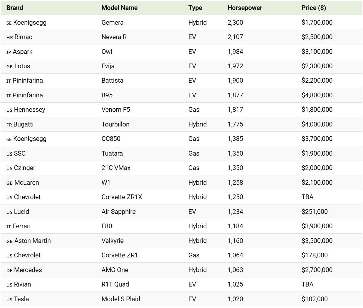 Electric vehicles are present throughout this ranking, with models from Tesla, Rivian, and Lucid appearing alongside million-dollar hypercars.