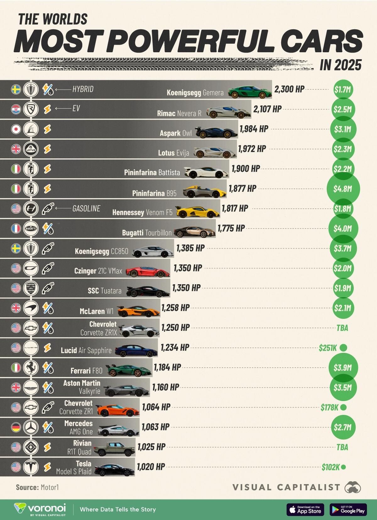 In this infographic, Visual Capitalist's Marcus Lu ranks the 20 most powerful cars of 2025, spanning gasoline, hybrid, and fully electric powertrains.